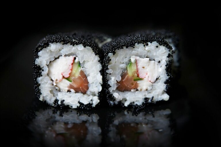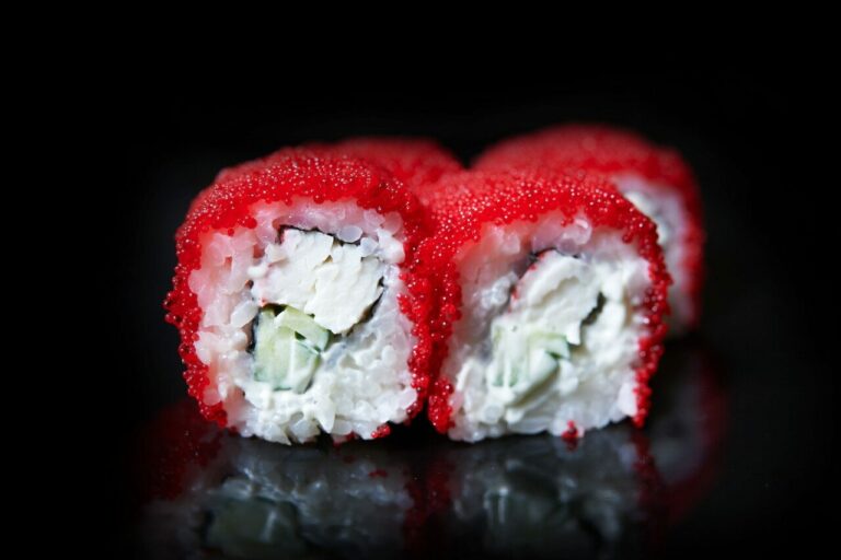 креветки, кунжут, лосось, майонез, мясо краба, огурец, соус спайси, соус унаги, сыр, тобико, угорь, Филадельфия