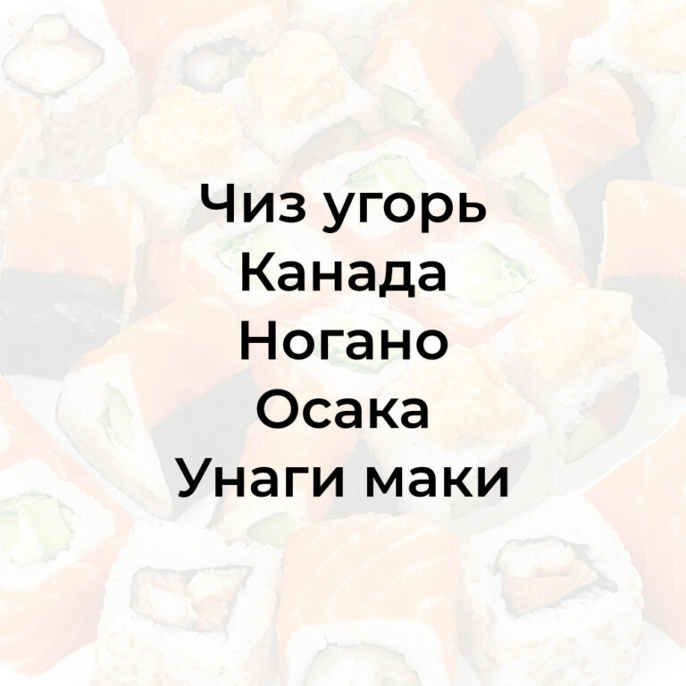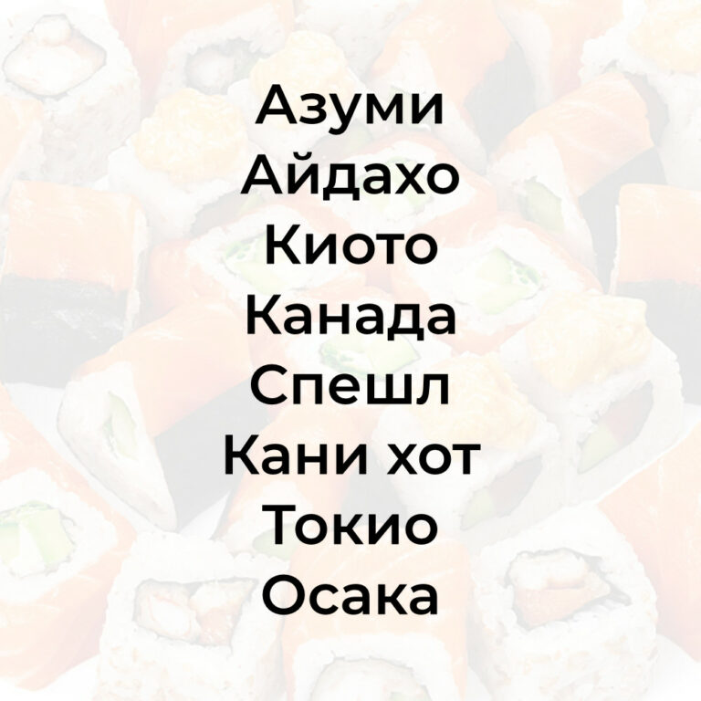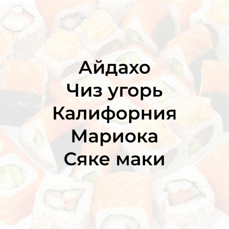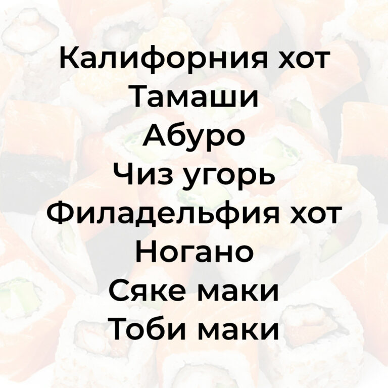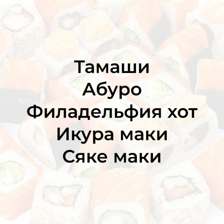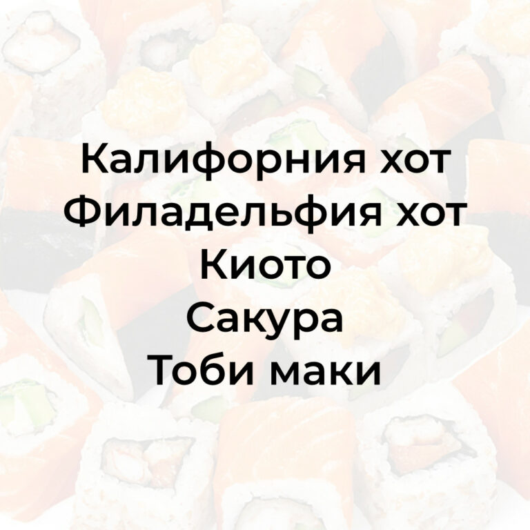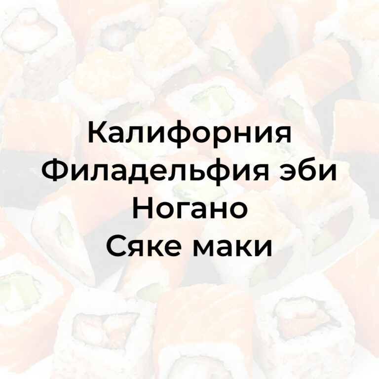 имбирь, креветки, кунжут, лосось, мясо краба, огурец, соус белый, соус спайси, соус унаги, сыр, тобико, угорь, Филадельфия | 2 170 г